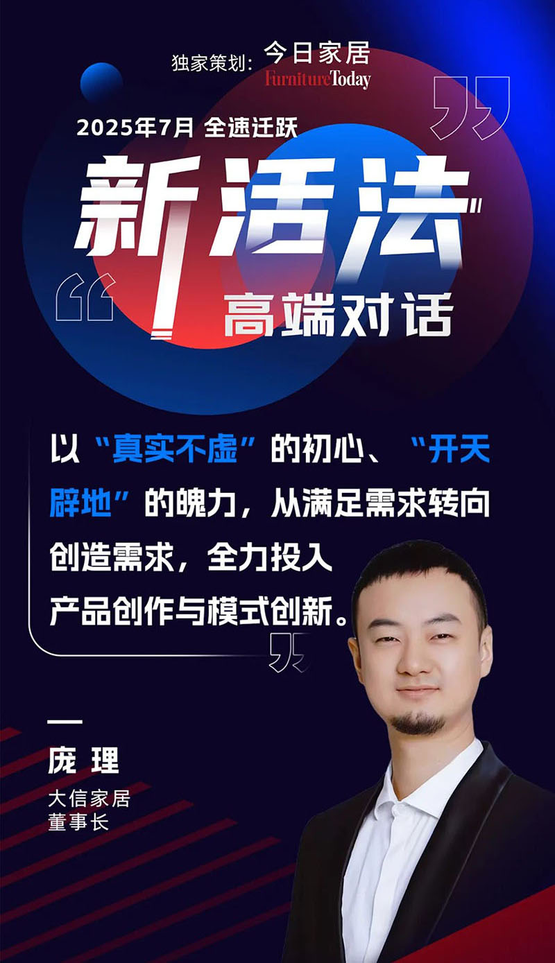 近日,由今日家居发起的《新活法・不确定时代的生意新解法》主题论坛重磅启幕,围绕四大核心议题展开思想碰撞,以实战经验共探新周期下的生意确定性进行思想碰撞!大信家居作为行业的头部企业,庞理董事长受邀参加论坛并发表对行业发展的独到见解。参加论坛的企业嘉宾还有今日家居主编高单单、诗尼曼家居董事长辛福民等5位行业代表。